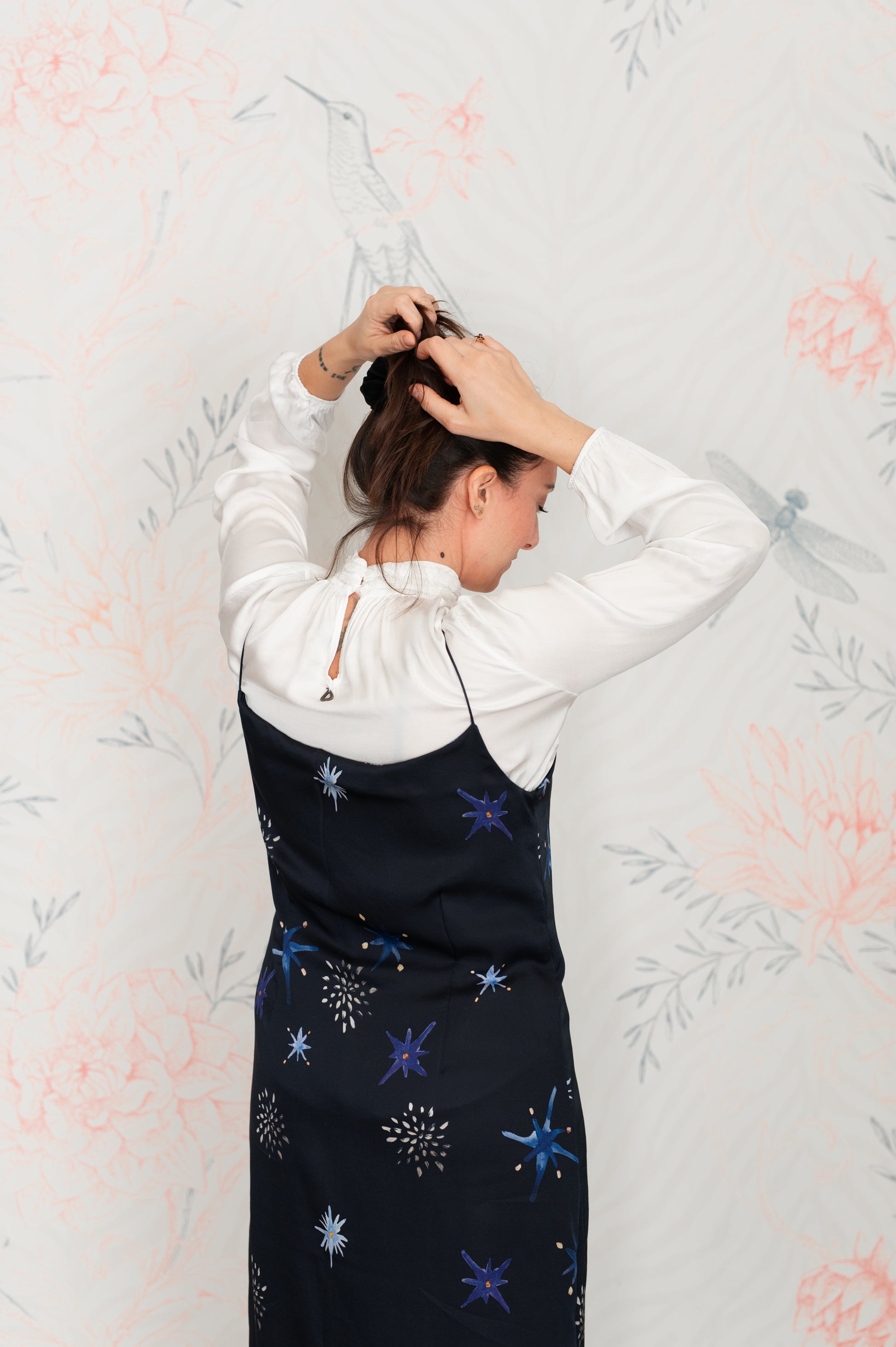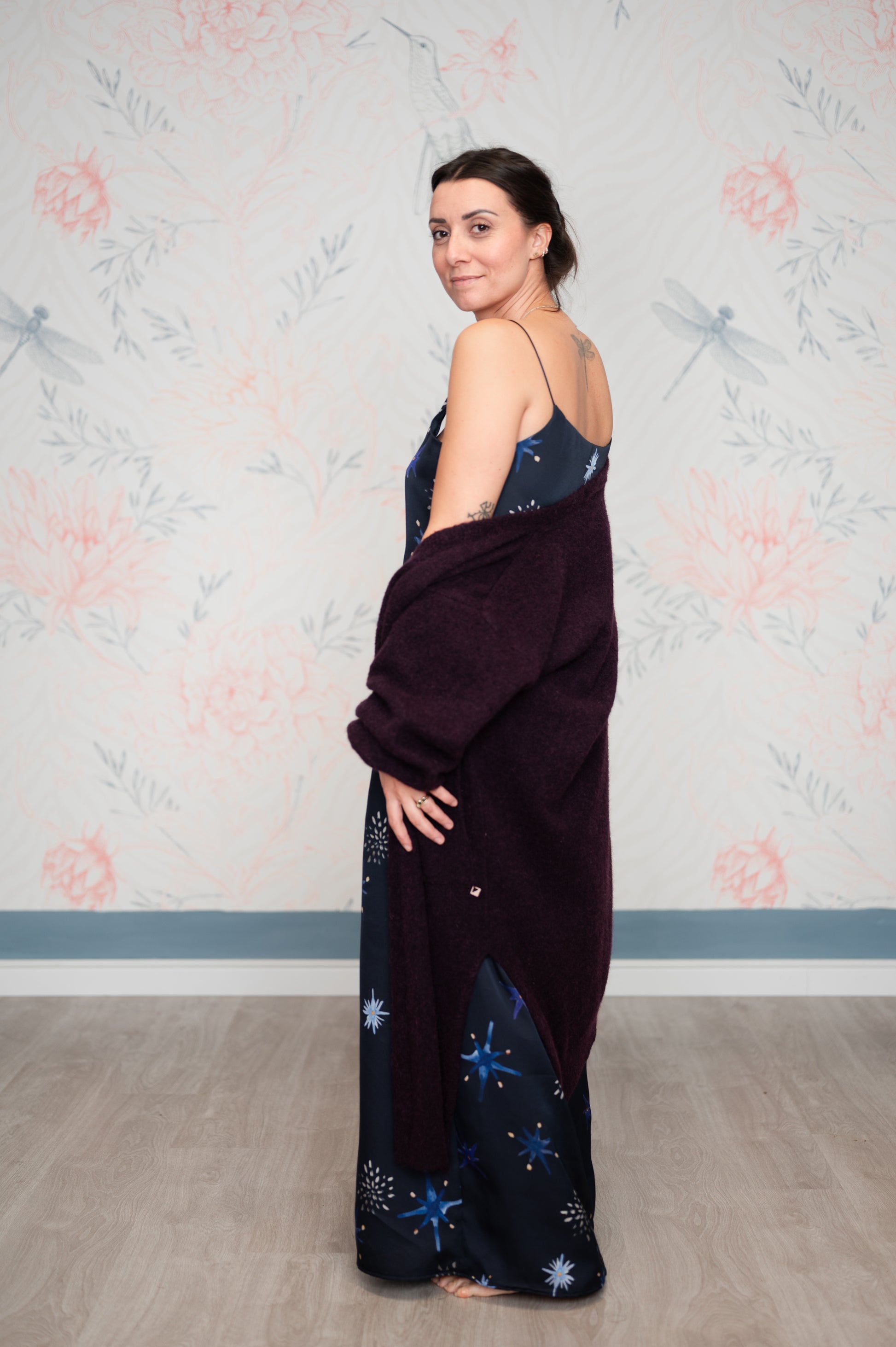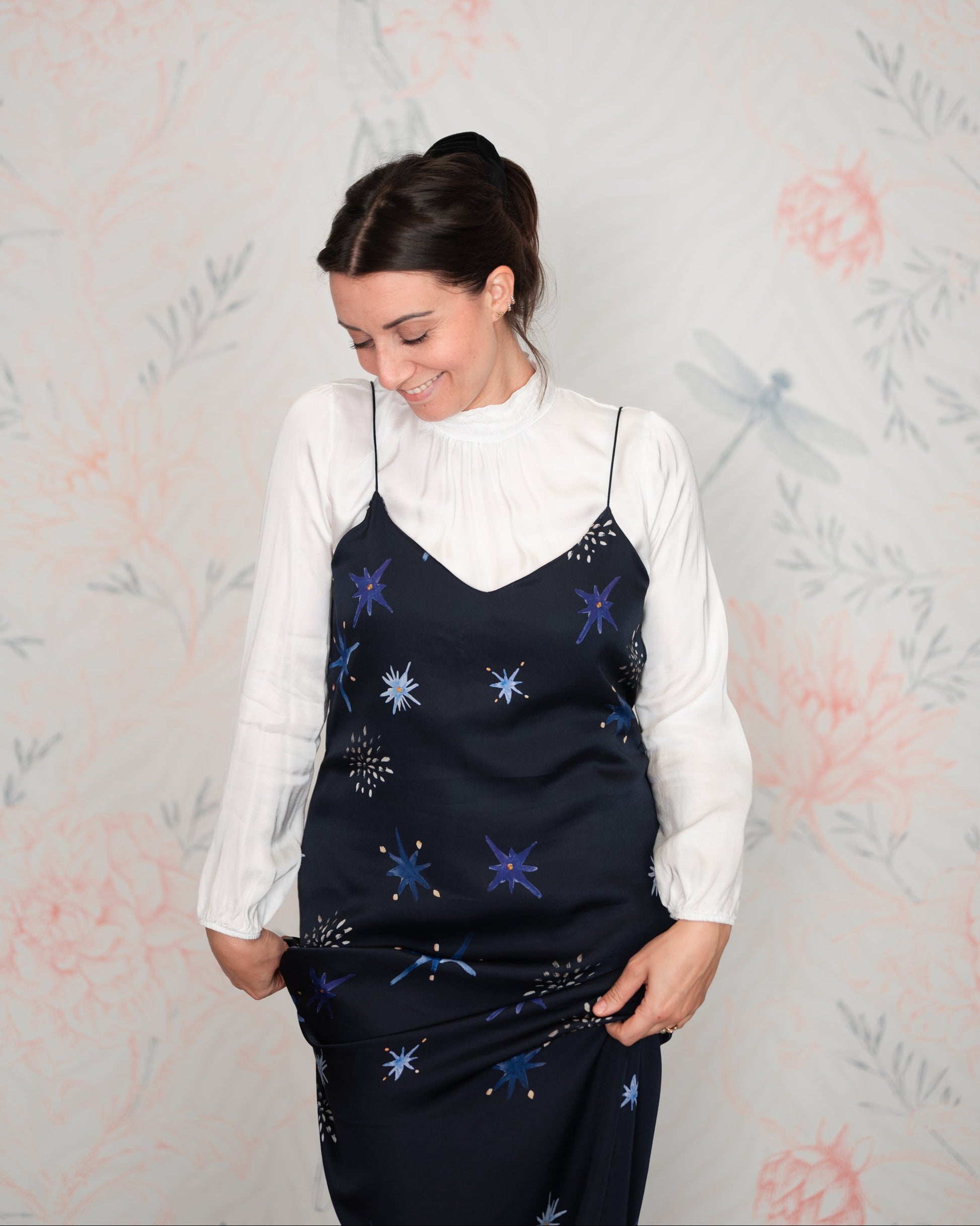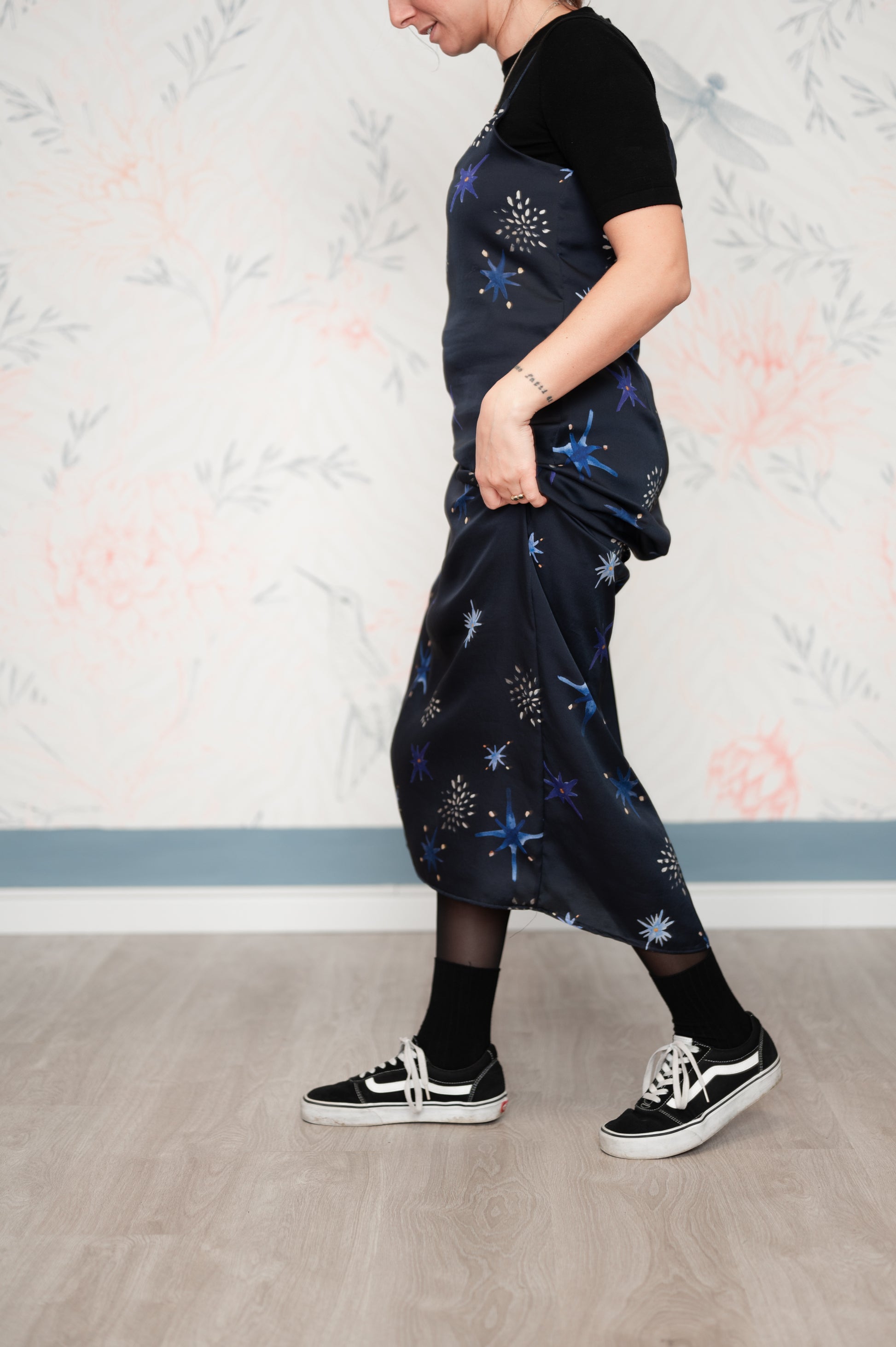 Pattern unico, studiato insieme a Livia Ricciardiello design&artist e disegnato da lei. I colori sono ispirati al blu profondo del cielo di notte con stelle dorate. Manifesto di coraggio e autenticità, per ricordarci sempre di sentirci bene.