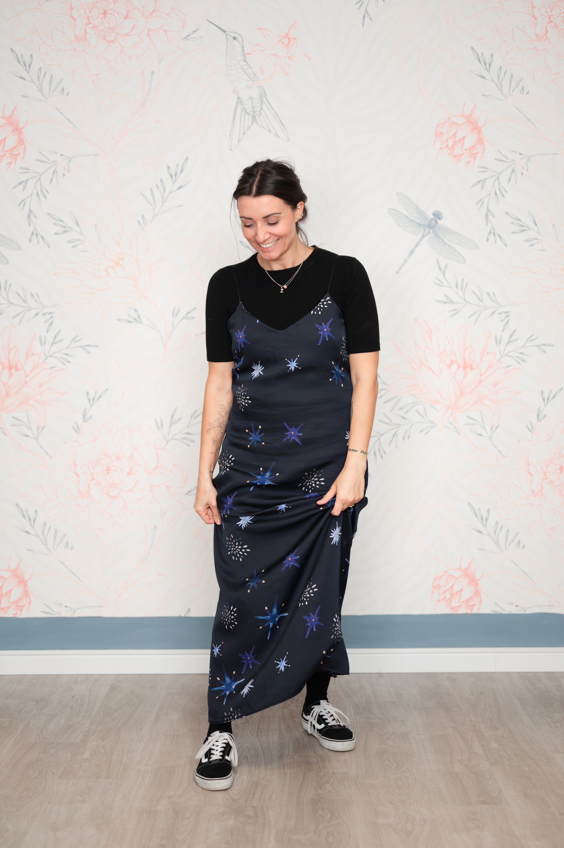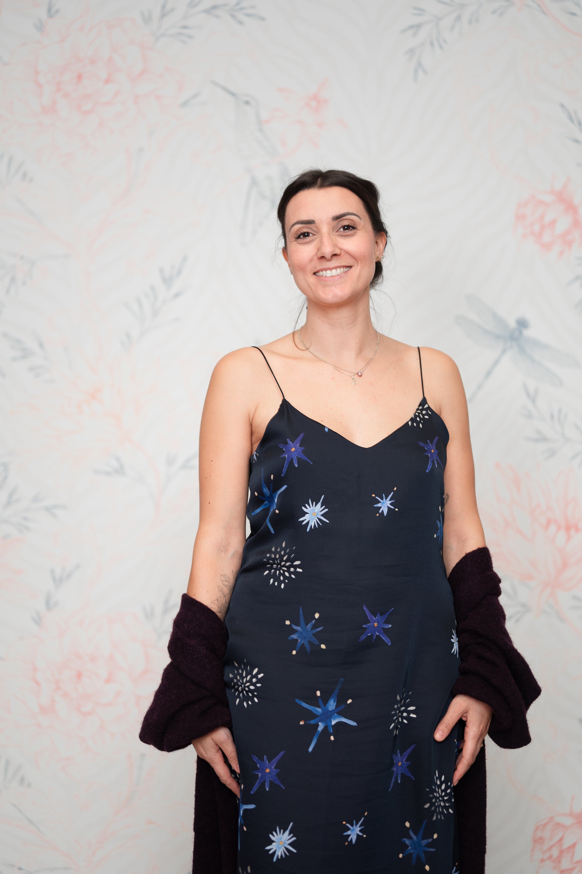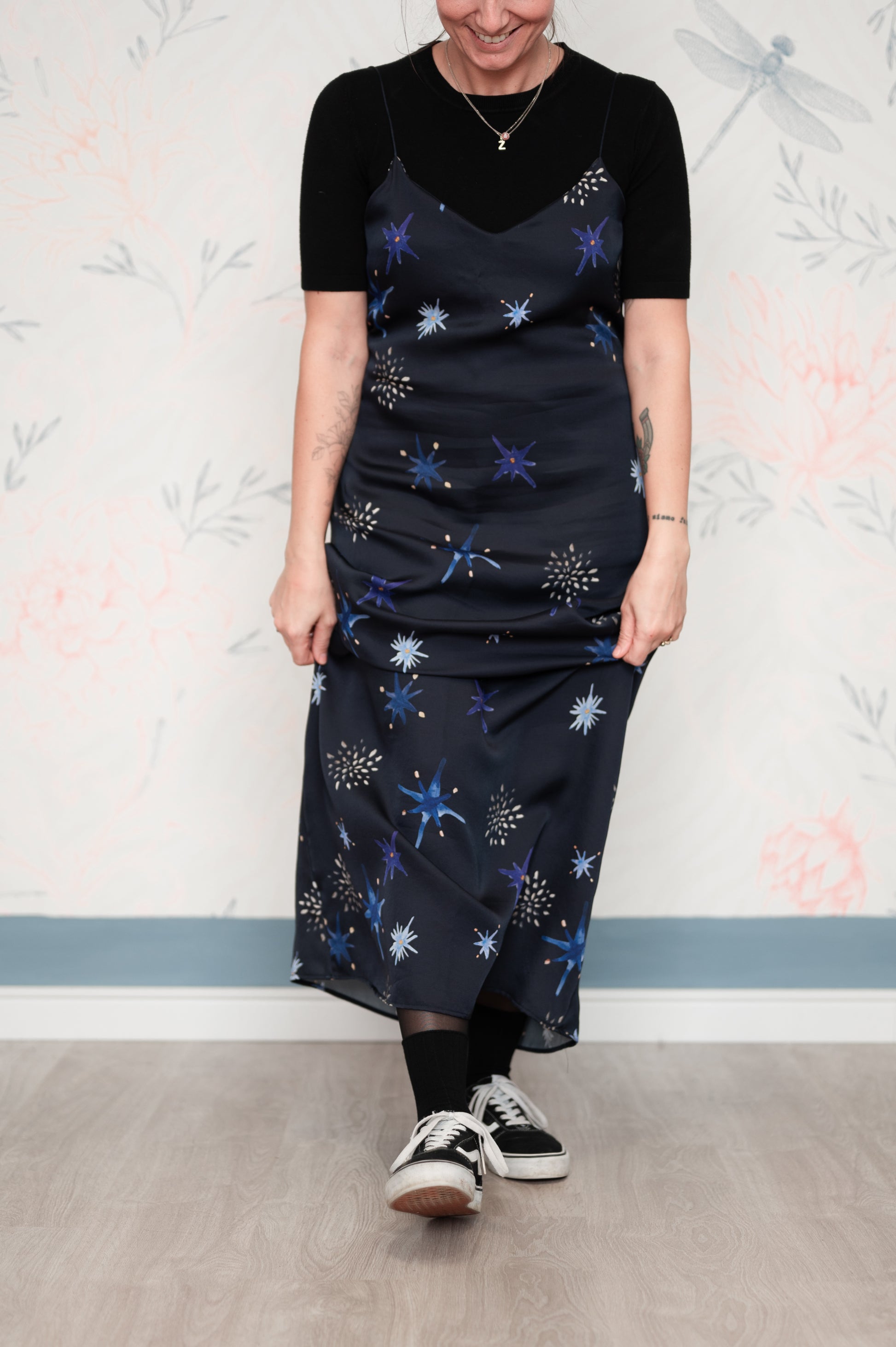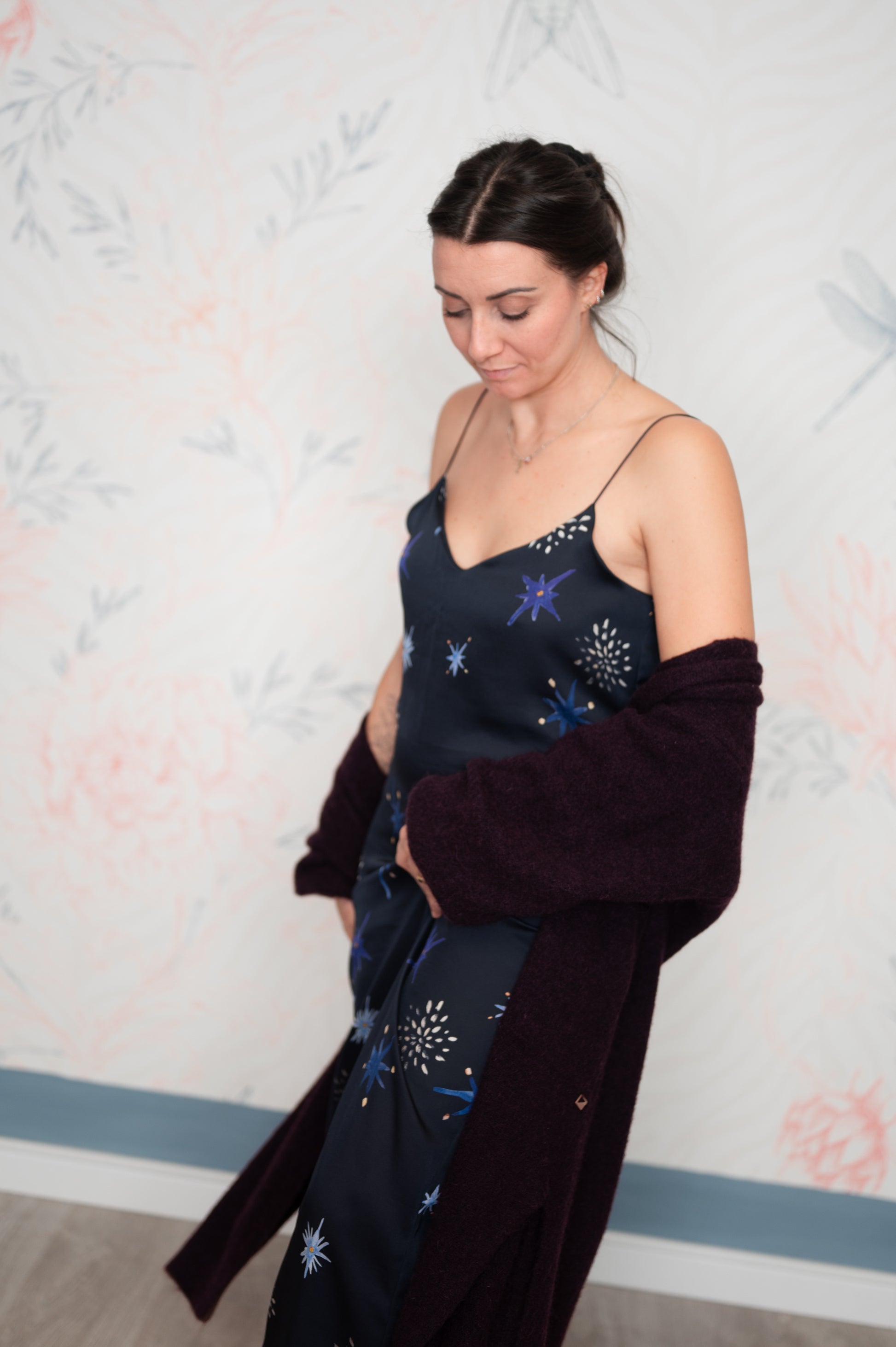 Pattern unico, studiato insieme a Livia Ricciardiello design&artist e disegnato da lei. I colori sono ispirati al blu profondo del cielo di notte con stelle dorate. Manifesto di coraggio e autenticità, per ricordarci sempre di sentirci bene.