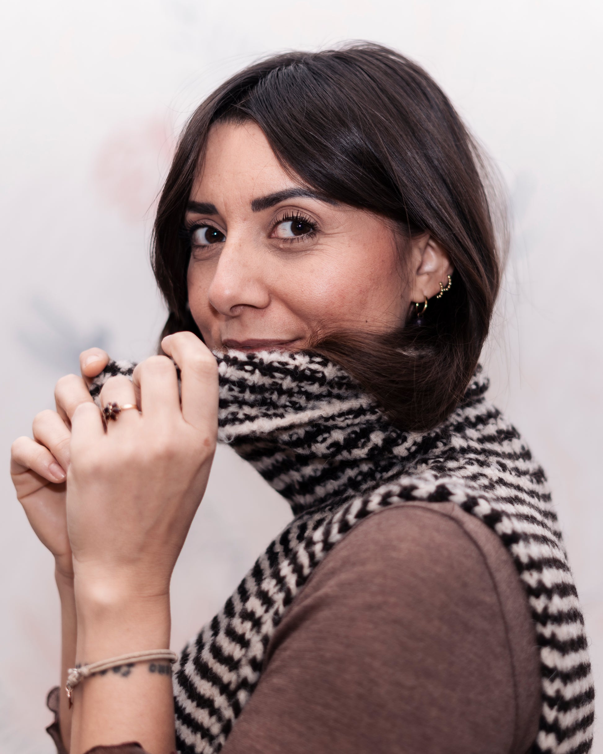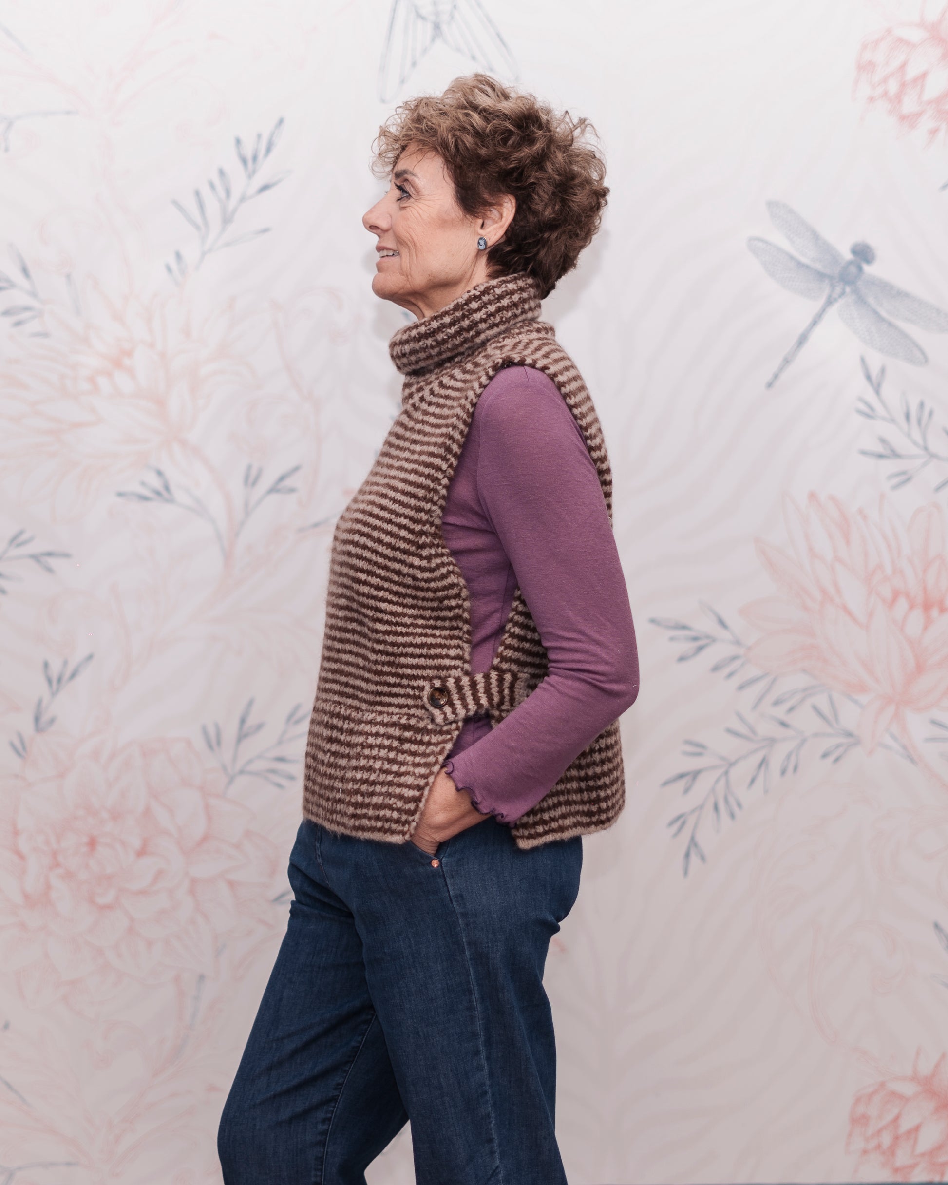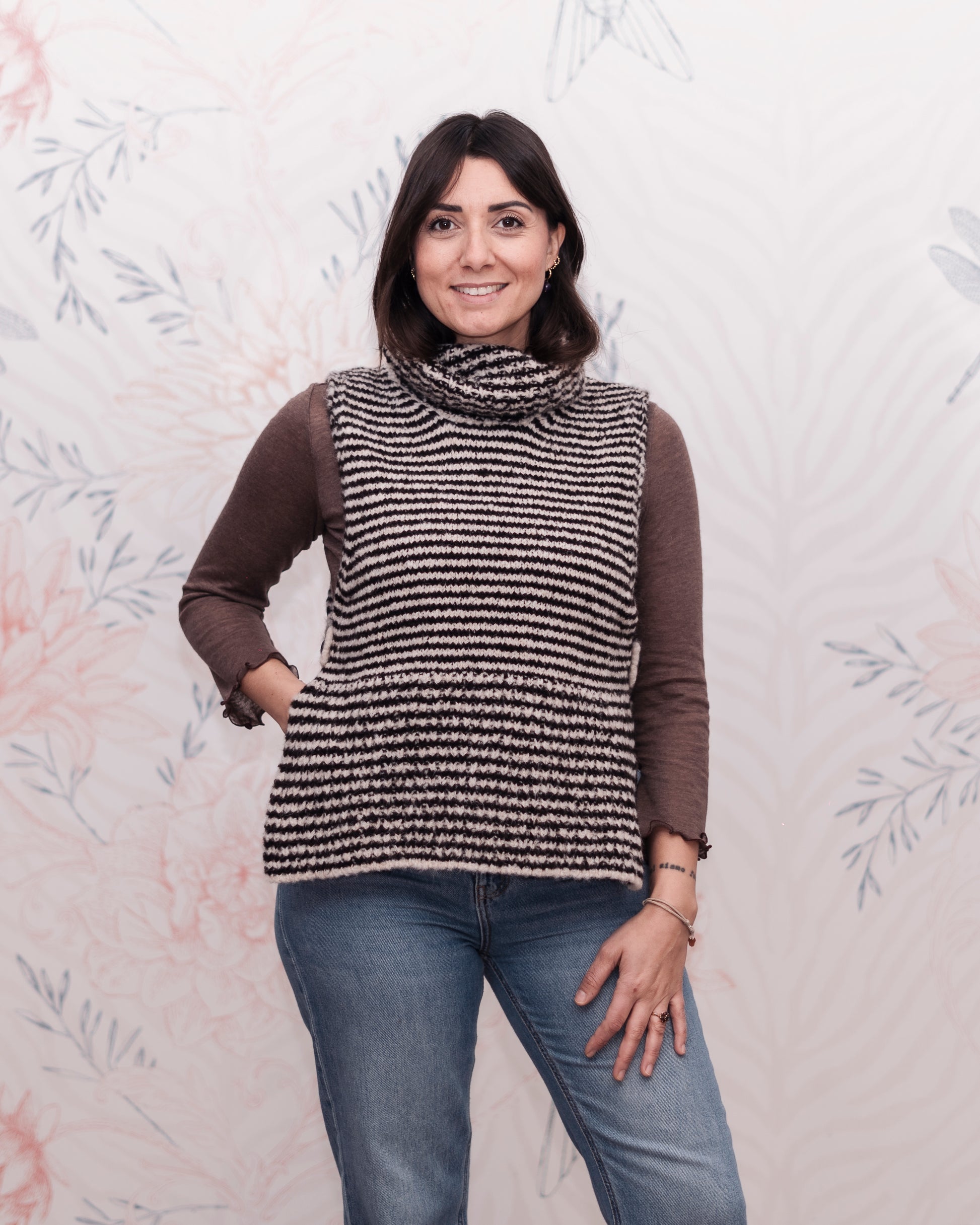 Questo inverno il Gilet Claire si indossa in stile Parisienne sopra ad una Maglina Frullino, abbinato ad un blazer vintage e panta Pijama. Ci invita a giocare con i capi che abbiamo già nell'armadio, mescolando capi di tendenza con quelli senza tempo o delle nostre nonne. Il collo alto ad anello dona raffinatezza con una allure di nonchalance da vere Parigine, da portare in modo casuale o piegato ordinato.