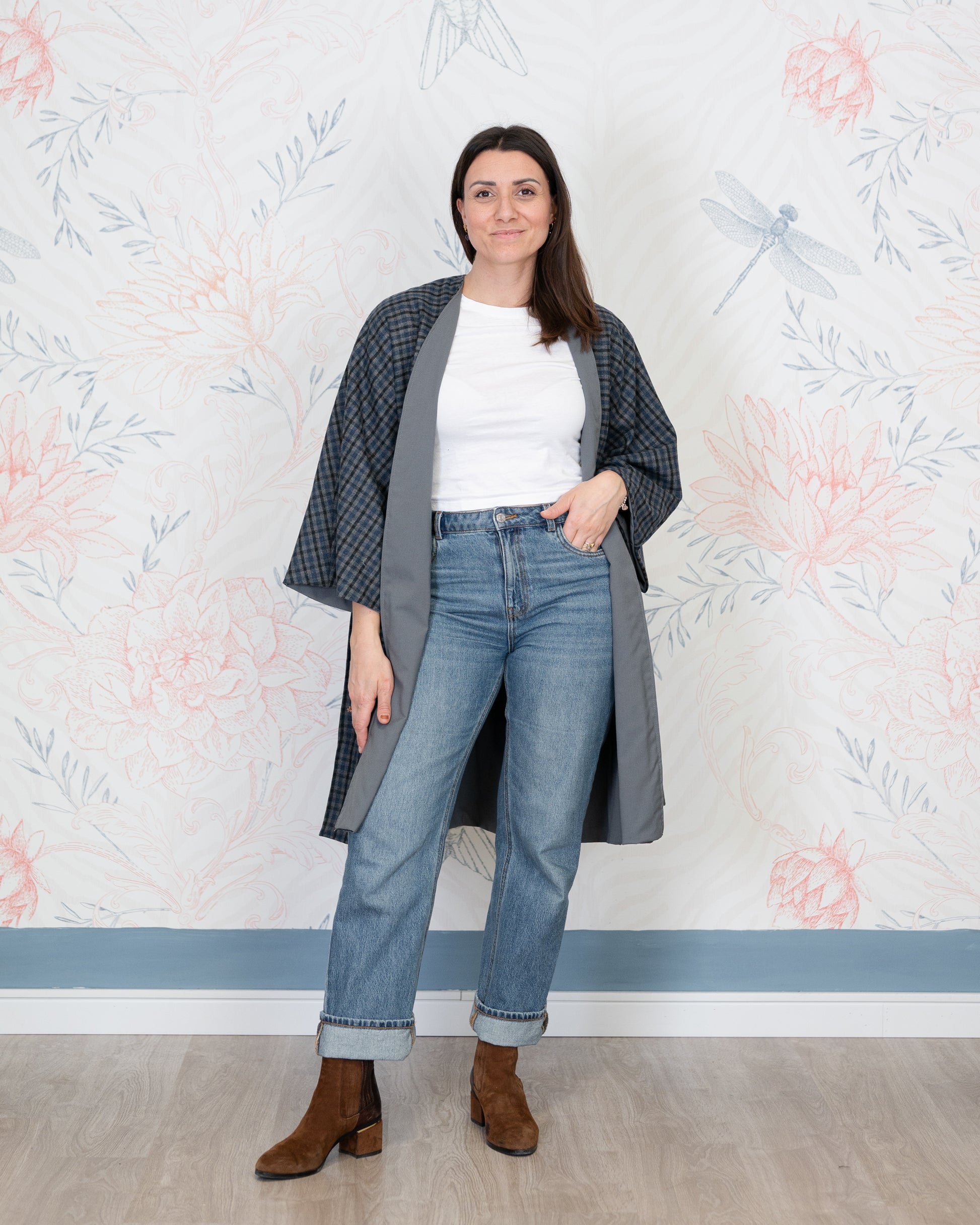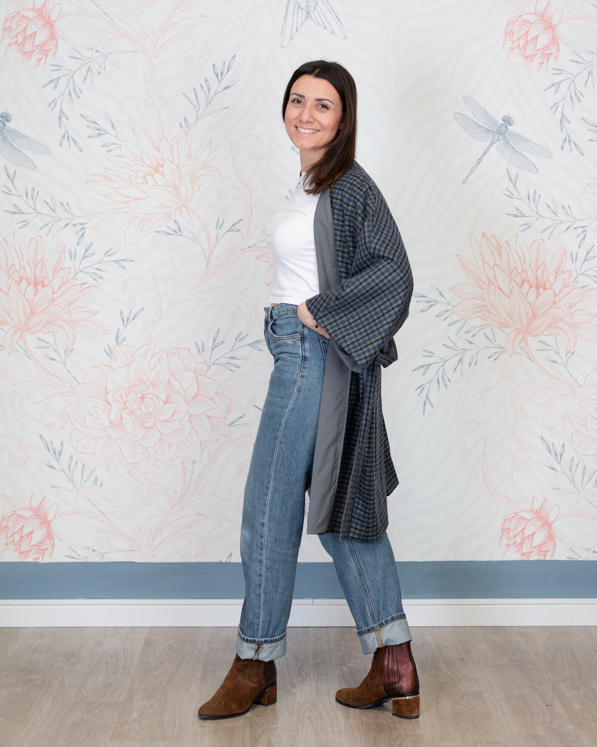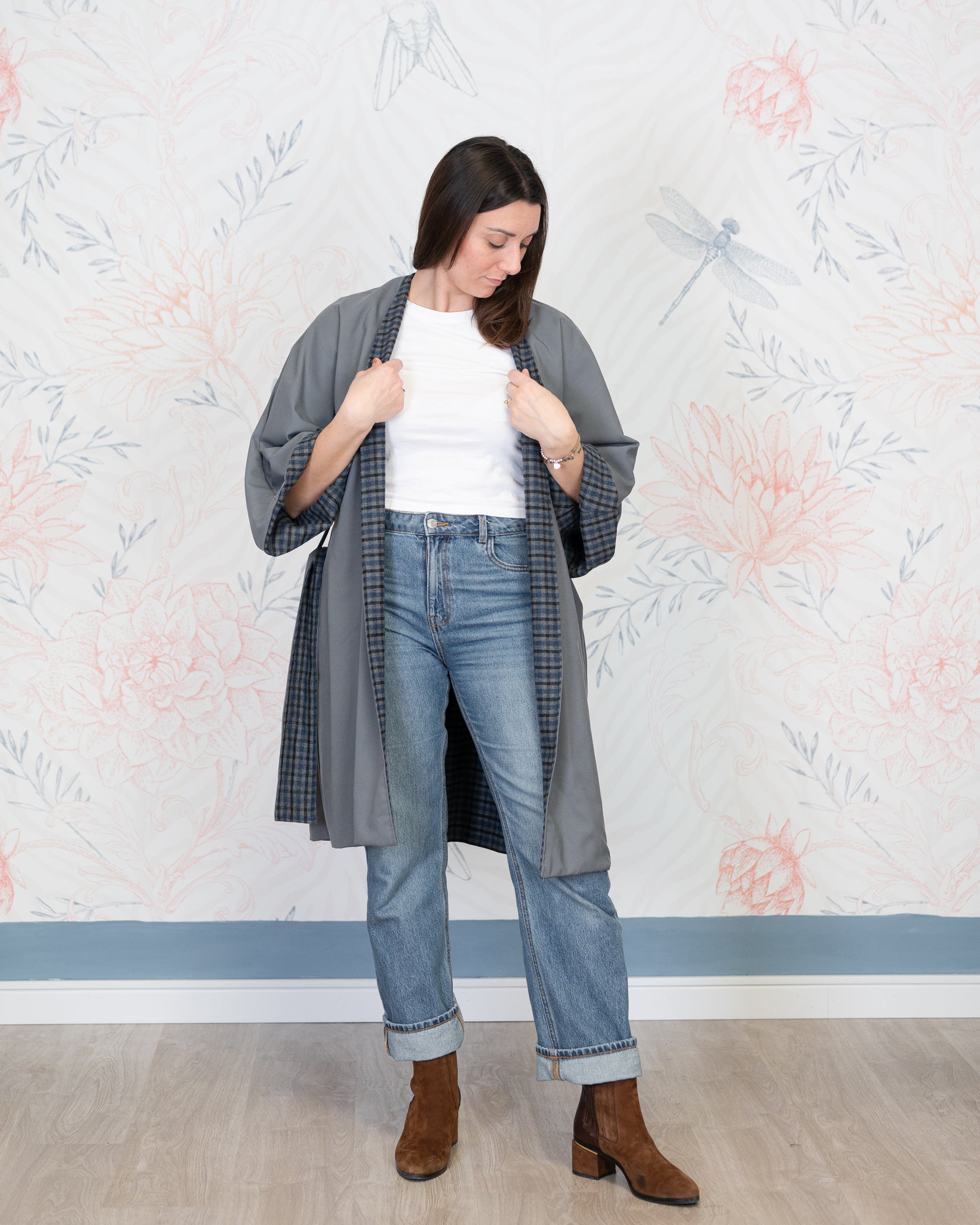 Le maniche sono lunghe e ampie, tipiche dei Kimoni. La cintura per cingere la vita è anch'essa reversibile e i passanti sono su entrambi i lati. Questo capo è lungo 98 cm dalla spalla al fondo.